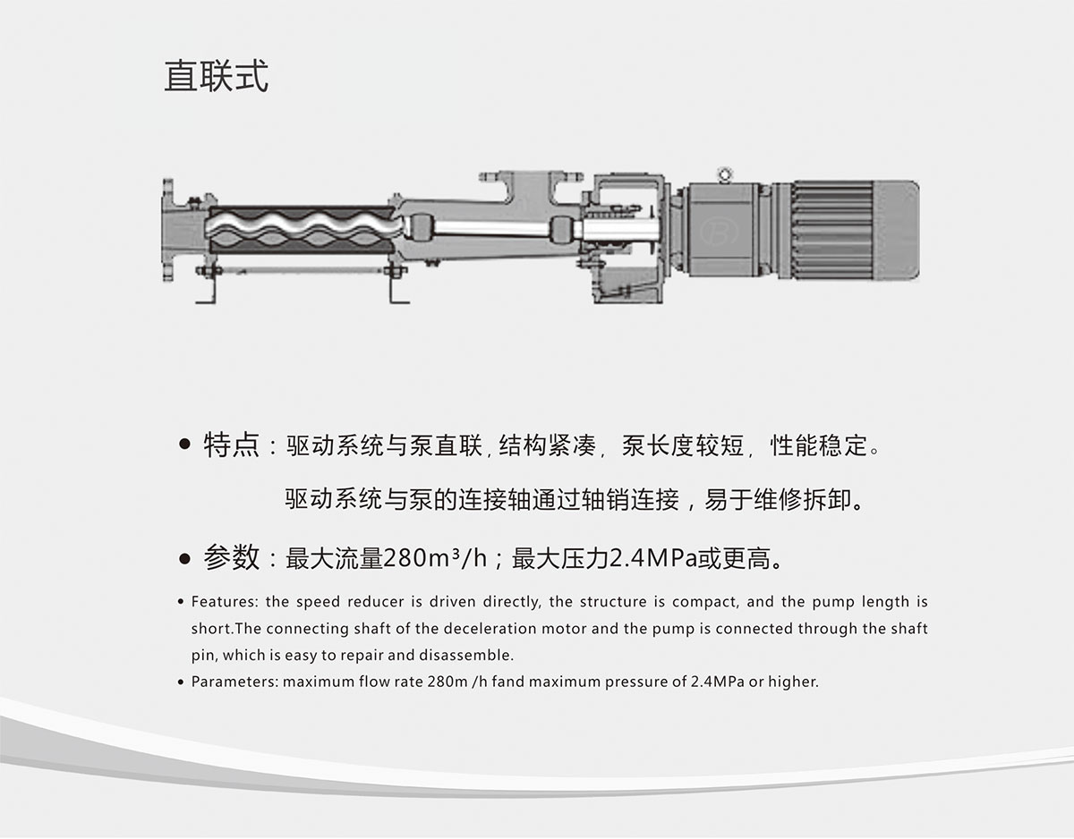 特色1 : 驅動體系與泵直聯,布局松散,泵長度較短,機能不變。
